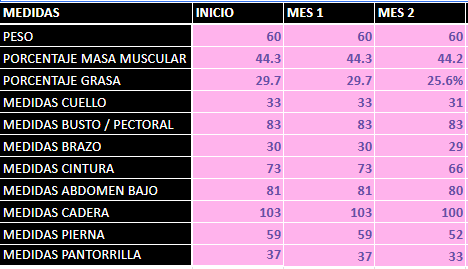 | % grasa corporal | 29.7 % | 25.6 % | Reducción de 4.1 puntos porcentuales de grasa corporal, lo que representa una pérdida significativa de tejido adiposo en un periodo corto. Indica alta adherencia al plan nutricional y estímulo adecuado del entrenamiento. |